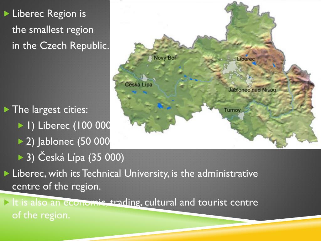 Liberec Region is the smallest region in the Czech Republic. • Thelargestcities: • 1) Liberec (100 000) • 2) Jablonec (50 000) • 3) Česká Lípa (35 000) • Liberec, with its Technical University, is the administrative centre of the region. • It is also an economic, trading, cultural and tourist centre of the region.