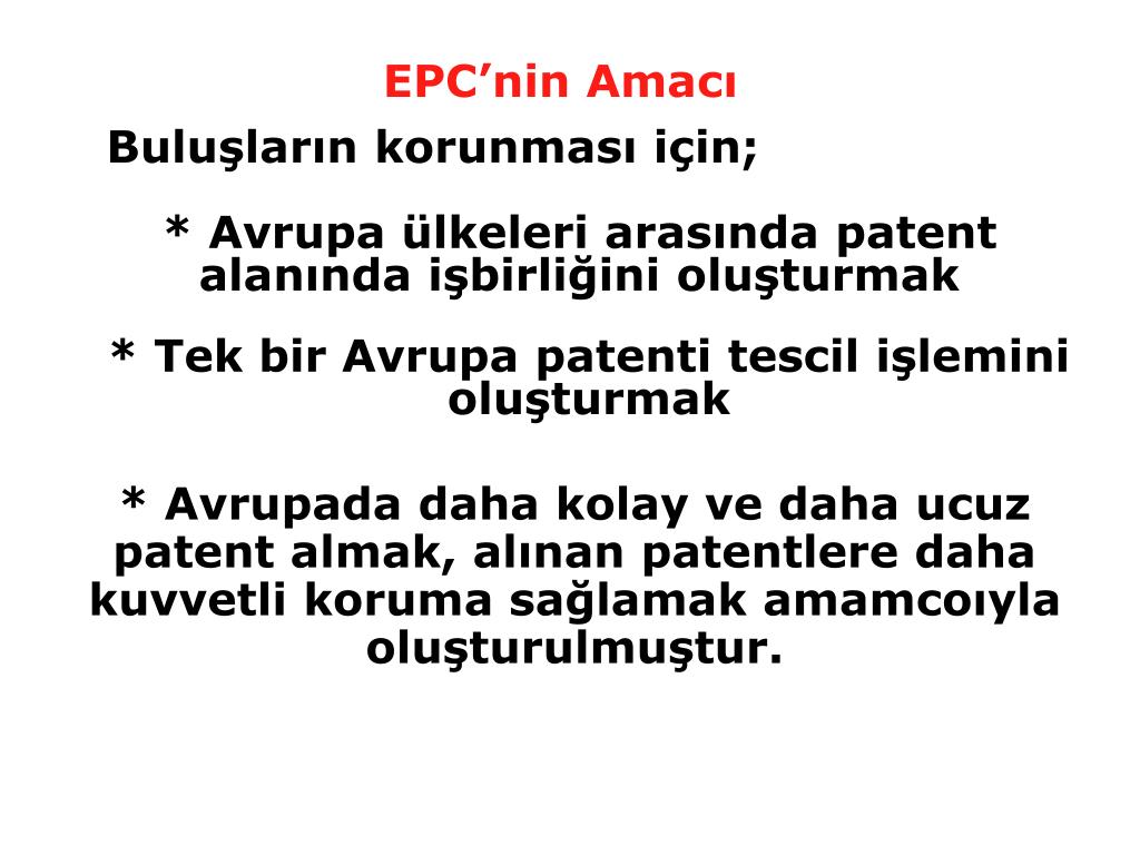 Buluşların korunması için; EPC’nin Amacı * Avrupa ülkeleri arasında patent alanında işbirliğini oluşturmak * Tek bir Avrupa patenti tescil işlemini oluşturmak * Avrupada daha kolay ve daha ucuz patent almak, alınan patentlere daha kuvvetli koruma sağlamak amamcoıyla oluşturulmuştur.