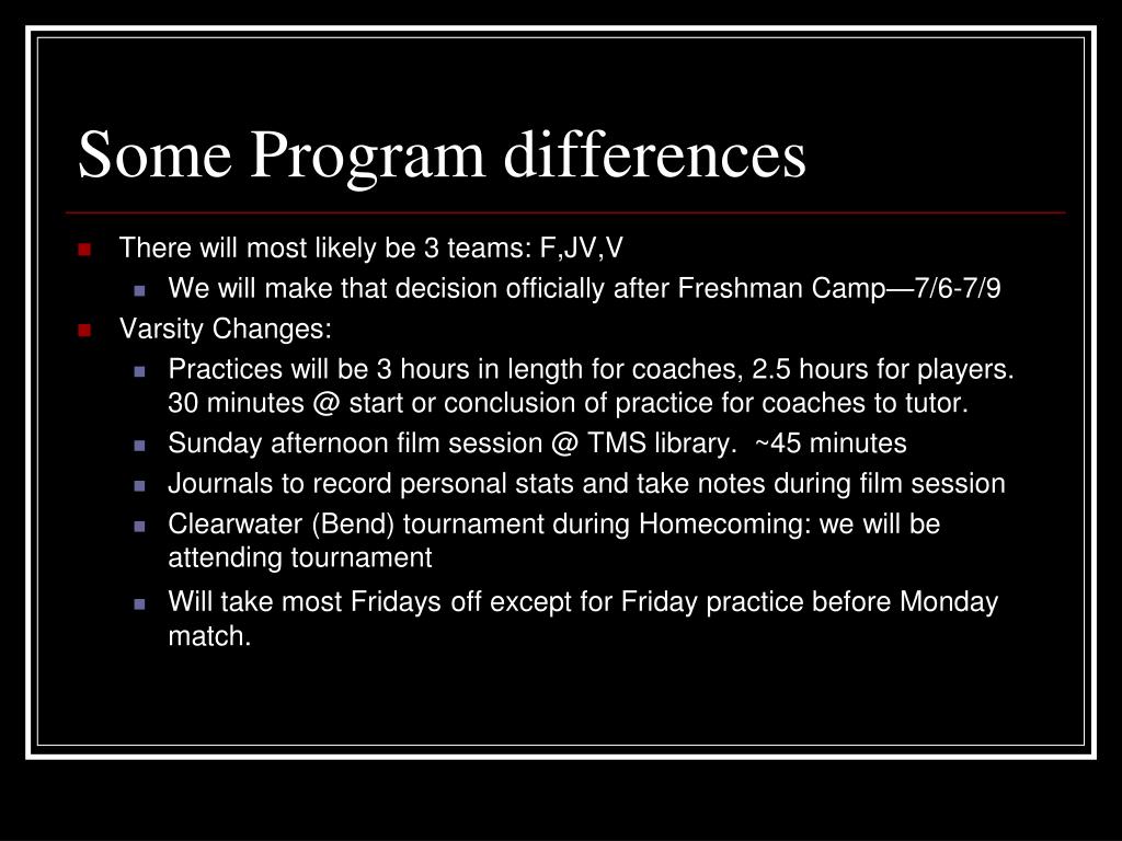 Some Program differences • There will most likely be 3 teams: F,JV,V • We will make that decision officially after Freshman Camp—7/6-7/9 • Varsity Changes: • Practices will be 3 hours in length for coaches, 2.5 hours for players. 30 minutes @ start or conclusion of practice for coaches to tutor. • Sunday afternoon film session @ TMS library. ~45 minutes • Journals to record personal stats and take notes during film session • Clearwater (Bend) tournament during Homecoming: we will be attending tournament • Will take most Fridaysoff except for Friday practice before Monday match.
