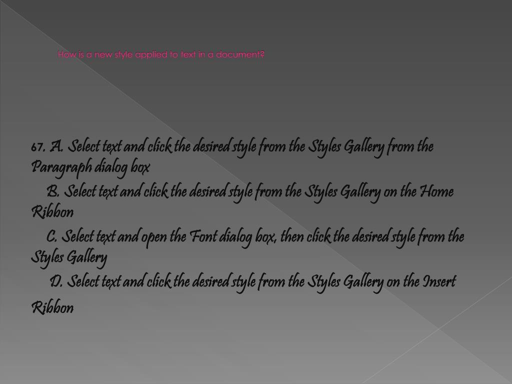 How is a new style applied to text in a document? 67. A. Select text and click the desired style from the Styles Gallery from the Paragraph dialog box B. Select text and click the desired style from the Styles Gallery on the Home Ribbon C. Select text and open the Font dialog box, then click the desired style from the Styles Gallery D. Select text and click the desired style from the Styles Gallery on the Insert Ribbon