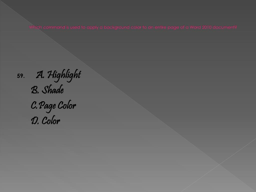 Which command is used to apply a background color to an entire page of a Word 2010 document? 59. A. Highlight B. Shade C.Page Color D. Color