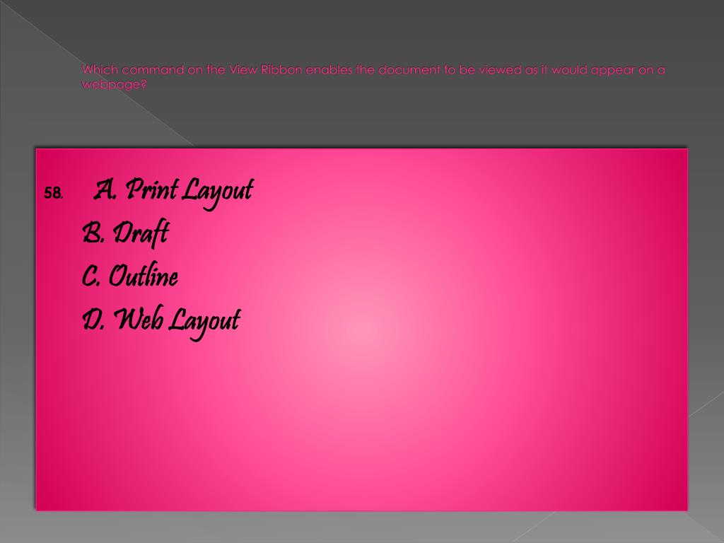 Which command on the View Ribbon enables the document to be viewed as it would appear on a webpage? 58. A. Print Layout B. Draft C. Outline D. Web Layout