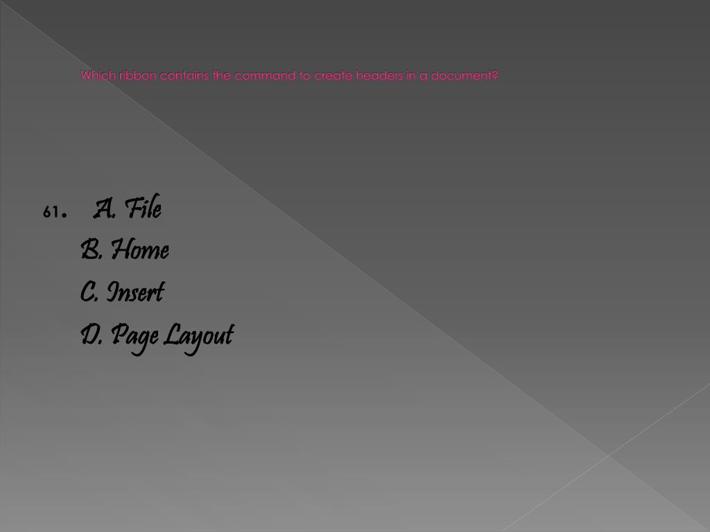 Which ribbon contains the command to create headers in a document? 61. A. File B. Home C. Insert D. Page Layout