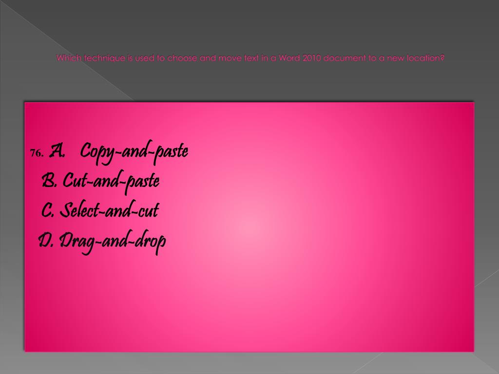 Which technique is used to choose and move text in a Word 2010 document to a new location? 76. A. Copy-and-paste B. Cut-and-paste C. Select-and-cut D. Drag-and-drop