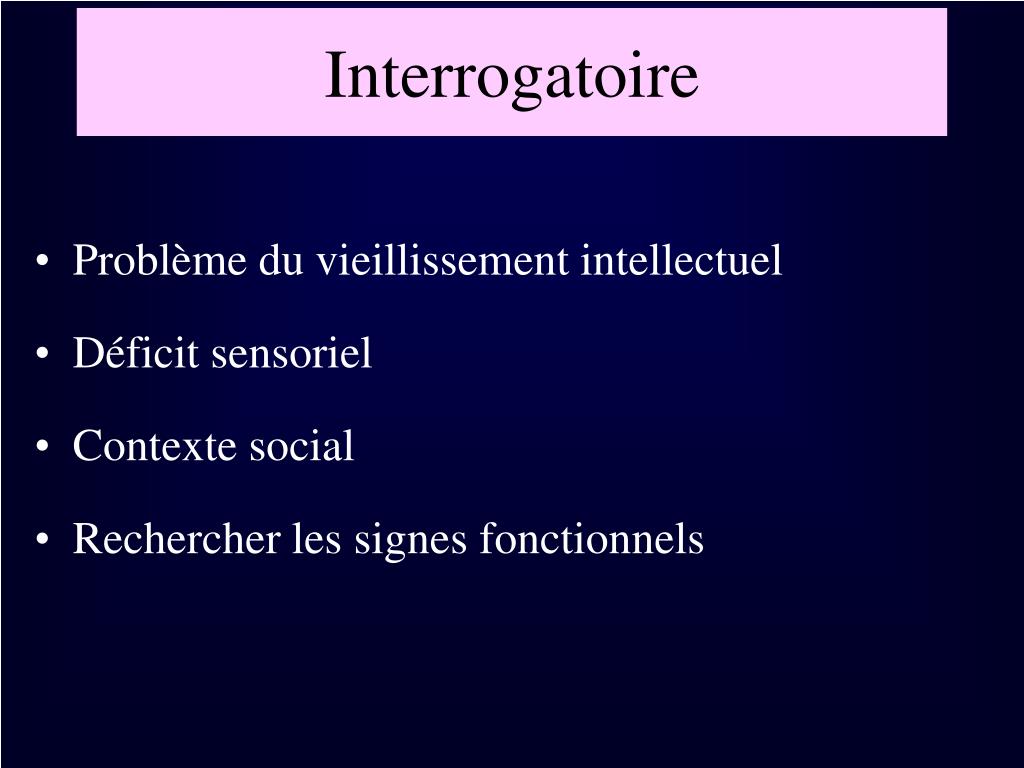 Interrogatoire • Problème du vieillissement intellectuel • Déficit sensoriel • Contexte social • Rechercher les signes fonctionnels