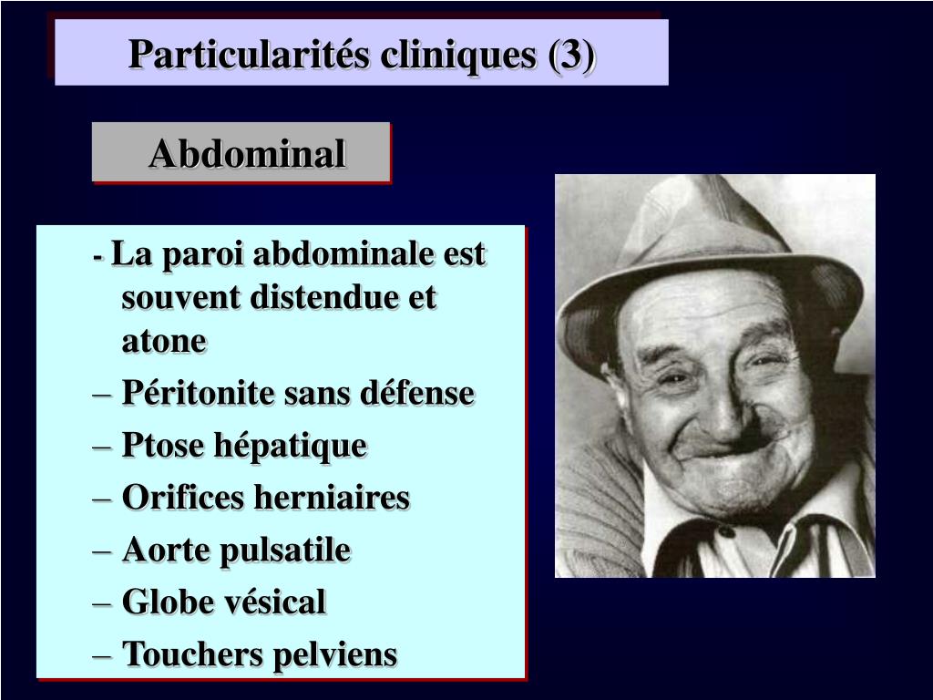 Particularités cliniques (3) • Abdominal • - La paroi abdominale est souvent distendue et atone • Péritonite sans défense • Ptose hépatique • Orifices herniaires • Aorte pulsatile • Globe vésical • Touchers pelviens