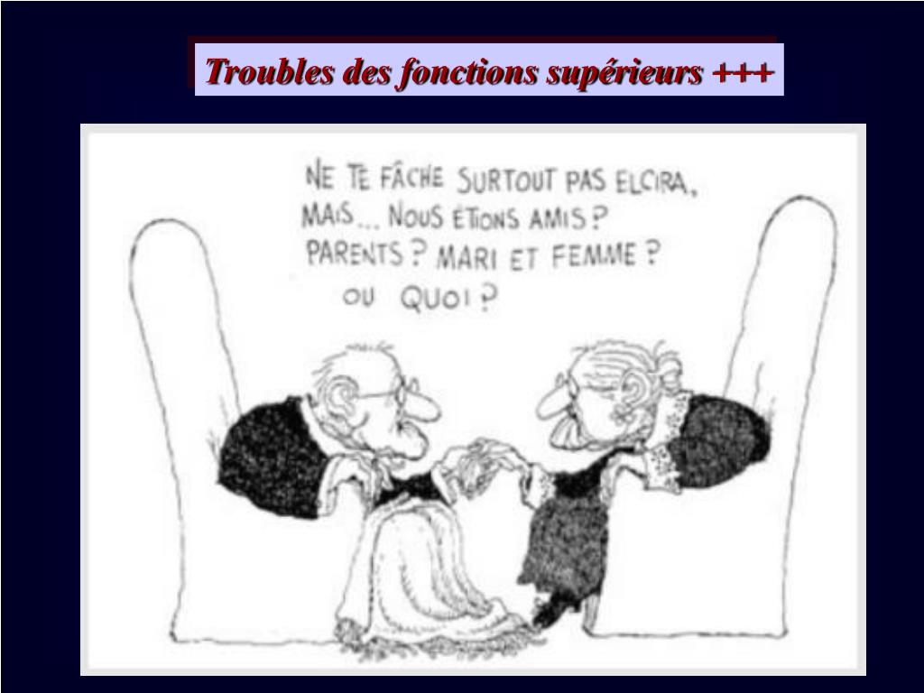 Troubles du langage • Ne pas parler fort ou en langage infantile • Employer un langage simple, et répéter la question sous différentes formes • Ne pas insister pour ne pas décourager le malade • Poser un maximum de questions dont la réponse peut être donnée par oui ou par non