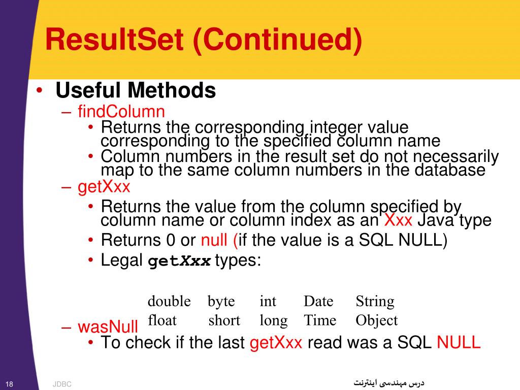 ResultSet (Continued) Useful Methods next Attempts to move to the nextrow in the ResultSet If successful true is returned; otherwise, false The first call to next positions the cursor at the first row Calling next clears the SQLWarning chain getWarnings Returns the first SQLWarning or null if no warnings occurred 17 JDBC