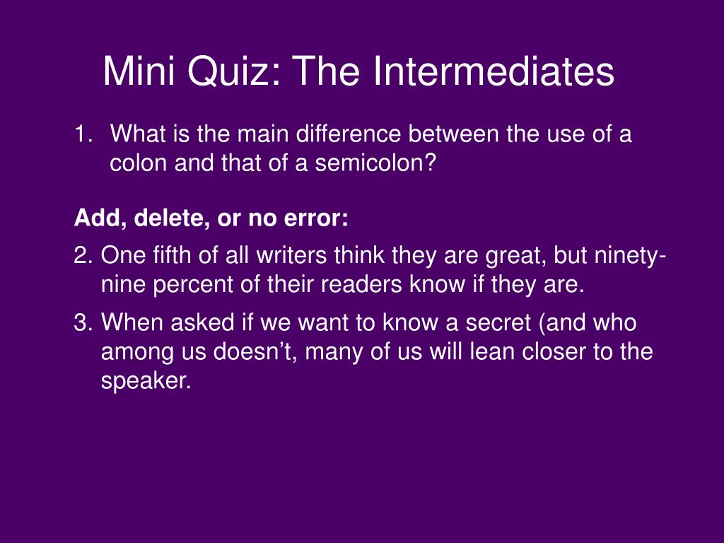 Mini Quiz: The Intermediates What is the main difference between the use of a colon and that of a semicolon? Add, delete, or no error: One fifth of all writers think they are great, but ninety-nine percent of their readers know if they are. When asked if we want to know a secret (and who among us doesn’t, many of us will lean closer to the speaker.