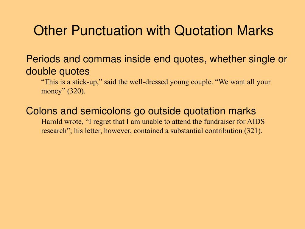 Other Punctuation with Quotation Marks Periods and commas inside end quotes, whether single or double quotes “This is a stick-up,” said the well-dressed young couple. “We want all your money” (320). Colons and semicolons go outside quotation marks Harold wrote, “I regret that I am unable to attend the fundraiser for AIDS research”; his letter, however, contained a substantial contribution (321).