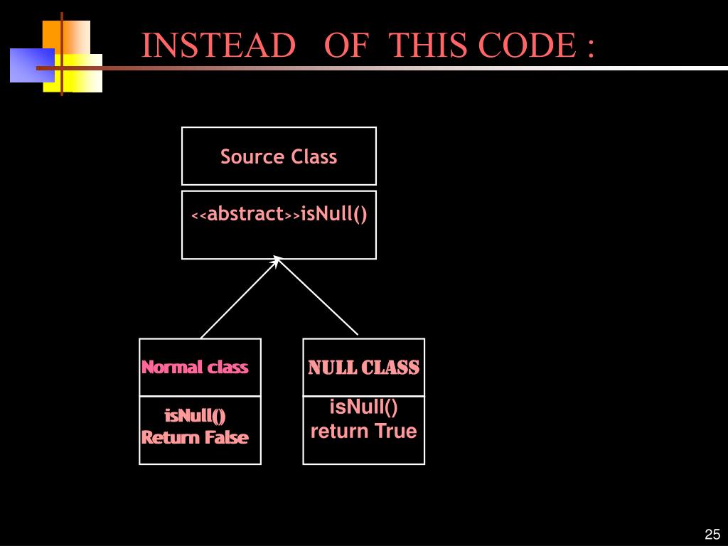 Source Class <<abstract>>isNull() Null Class isNull() return True INSTEAD OF THIS CODE : Normal class Normal class isNull() Return False isNull() Return False