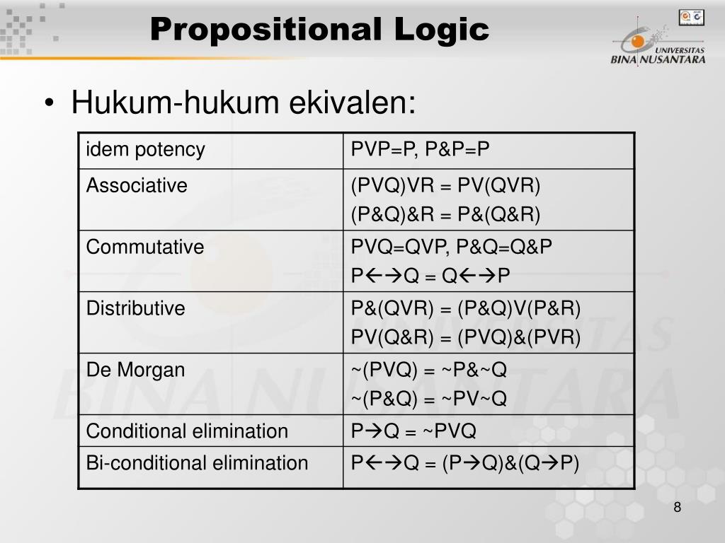 Propositional Logic Contoh: • ((P&~Q)R)VQ • Let P is true, Q is false, R is false • Rule 2: ~Q is true • Rule 3: (P&~Q) is true • Rule 6: (P&~Q)R is false • Rule 5: statement is false