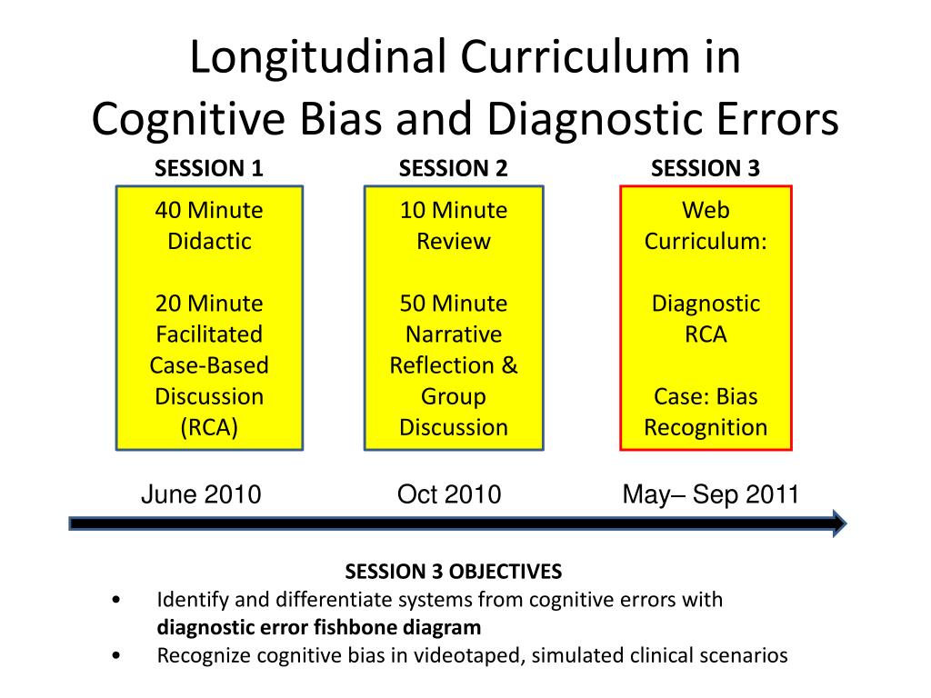 Longitudinal Curriculum in Cognitive Bias and Diagnostic Errors SESSION 1 SESSION 2 SESSION 3 40 Minute Didactic 20 Minute Facilitated Case-Based Discussion (RCA) 10 Minute Review 50 Minute Narrative Reflection & Group Discussion Web Curriculum: Diagnostic RCA Case: Bias Recognition June 2010 Oct 2010 May – Sep 2011 SESSION 1 OBJECTIVES Appreciate the impact of diagnostic errors in medicine Differentiate systems errors from cognitive errors Identify common biases