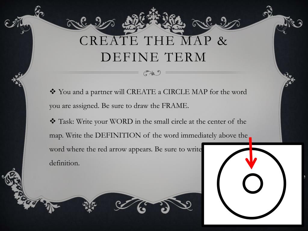 Create the Map & Define Term You and a partner will CREATE a CIRCLE MAP for the word you are assigned. Be sure to draw the FRAME. Task: Write your WORD in the small circle at the center of the map. Write the DEFINITION of the word immediately above the word where the red arrow appears. Be sure to write the complete definition.