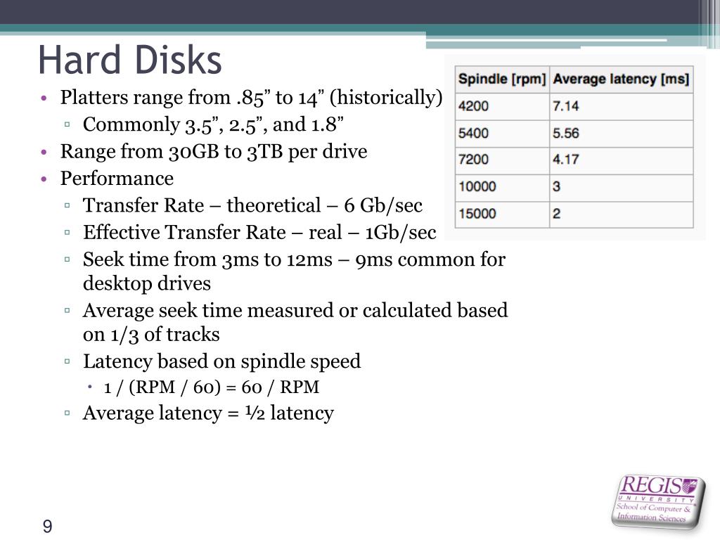 Hard Disks • Platters range from .85” to 14” (historically) • Commonly 3.5”, 2.5”, and 1.8” • Range from 30GB to 3TB per drive • Performance • Transfer Rate – theoretical – 6 Gb/sec • Effective Transfer Rate – real – 1Gb/sec • Seek time from 3ms to 12ms – 9ms common for desktop drives • Average seek time measured or calculated based on 1/3 of tracks • Latency based on spindle speed • 1 / (RPM / 60) = 60 / RPM • Average latency = ½ latency