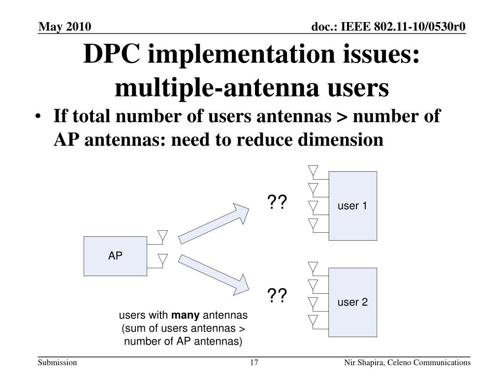 DPC for MU-MIMO. Authors:. Date: 2010-05-16. Abstract. What is DPC? Why use DPC? Detailed DPC use-case examples: Dynamic insertion/deletion of users Per-antenna power utilization DPC Implementation issues Multiple antenna user Dithering Low SNR issues: Inflating, improved LLRs.