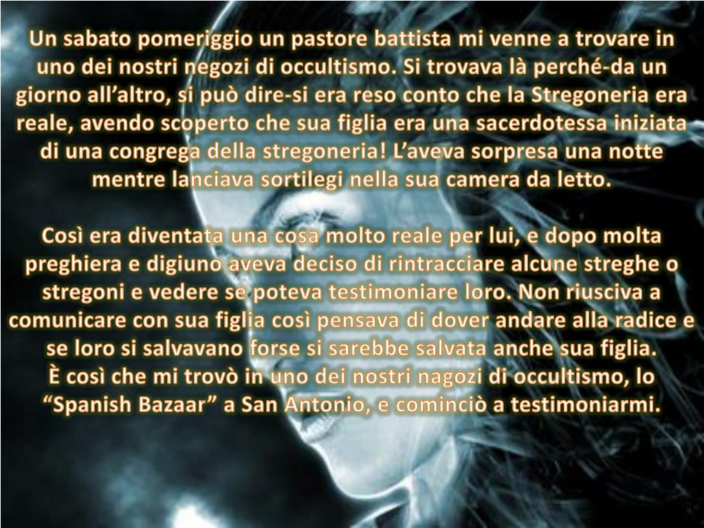 Un sabato pomeriggio un pastore battista mi venne a trovare in uno dei nostri negozi di occultismo. Si trovava là perché-da un giorno all’altro, si può dire-si era reso conto che la Stregoneria era reale, avendo scoperto che sua figlia era una sacerdotessa iniziata di una congrega della stregoneria! L’aveva sorpresa una notte mentre lanciava sortilegi nella sua camera da letto. Così era diventata una cosa molto reale per lui, e dopo molta preghiera e digiuno aveva deciso di rintracciare alcune streghe o stregoni e vedere se poteva testimoniare loro. Non riusciva a comunicare con sua figlia così pensava di dover andare alla radice e se loro si salvavano forse si sarebbe salvata anche sua figlia. È così che mi trovò in uno dei nostri nagozi di occultismo, lo “SpanishBazaar” a San Antonio, e cominciò a testimoniarmi.