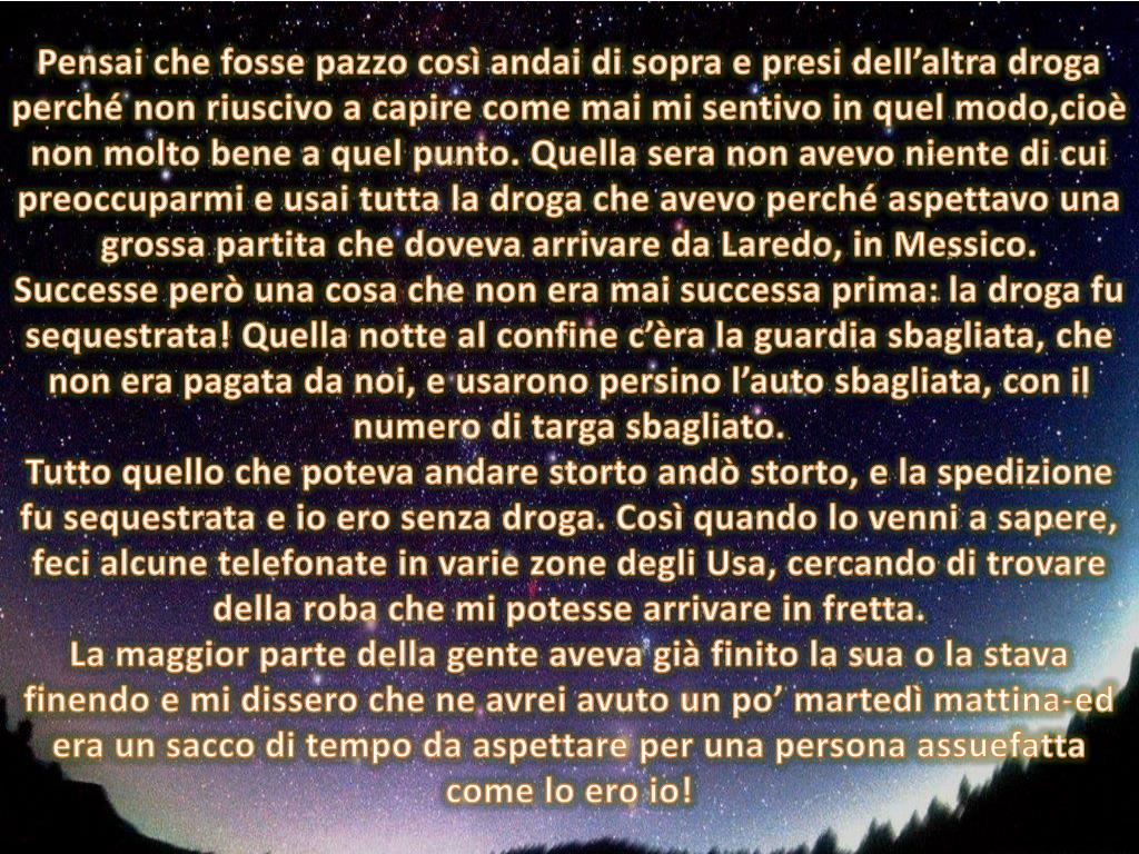 Pensai che fosse pazzo così andai di sopra e presi dell’altra droga perché non riuscivo a capire come mai mi sentivo in quel modo,cioè non molto bene a quel punto. Quella sera non avevo niente di cui preoccuparmi e usai tutta la droga che avevo perché aspettavo una grossa partita che doveva arrivare da Laredo, in Messico. Successe però una cosa che non era mai successa prima: la droga fu sequestrata! Quella notte al confine c’èra la guardia sbagliata, che non era pagata da noi, e usarono persino l’auto sbagliata, con il numero di targa sbagliato. Tutto quello che poteva andare storto andò storto, e la spedizione fu sequestrata e io ero senza droga. Così quando lo venni a sapere, feci alcune telefonate in varie zone degli Usa, cercando di trovare della roba che mi potesse arrivare in fretta. La maggior parte della gente aveva già finito la sua o la stava finendo e mi dissero che ne avrei avuto un po’ martedì mattina-ed era un sacco di tempo da aspettare per una persona assuefatta come lo ero io!