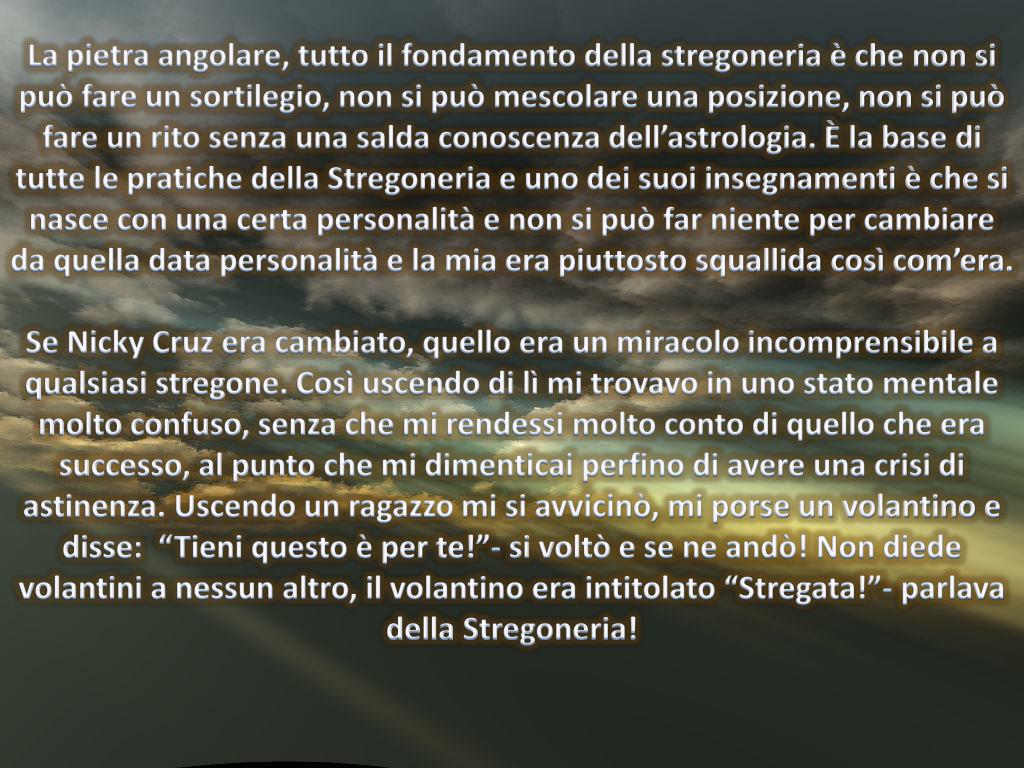 La pietra angolare, tutto il fondamento della stregoneria è che non si può fare un sortilegio, non si può mescolare una posizione, non si può fare un rito senza una salda conoscenza dell’astrologia. È la base di tutte le pratiche della Stregoneria e uno dei suoi insegnamenti è che si nasce con una certa personalità e non si può far niente per cambiare da quella data personalità e la mia era piuttosto squallida così com’era. Se Nicky Cruz era cambiato, quello era un miracolo incomprensibile a qualsiasi stregone. Così uscendo di lì mi trovavo in uno stato mentale molto confuso, senza che mi rendessi molto conto di quello che era successo, al punto che mi dimenticai perfino di avere una crisi di astinenza. Uscendo un ragazzo mi si avvicinò, mi porse un volantino e disse: “Tieni questo è per te!”- si voltò e se ne andò! Non diede volantini a nessun altro, il volantino era intitolato “Stregata!”- parlava della Stregoneria!