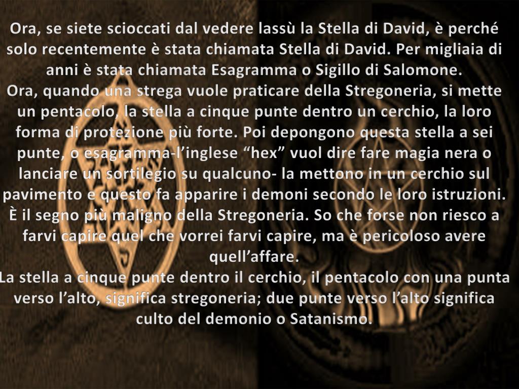 Ora, se siete scioccati dal vedere lassù la Stella di David, è perché solo recentemente è stata chiamata Stella di David. Per migliaia di anni è stata chiamata Esagramma o Sigillo di Salomone. Ora, quando una strega vuole praticare della Stregoneria, si mette un pentacolo, la stella a cinque punte dentro un cerchio, la loro forma di protezione più forte. Poi depongono questa stella a sei punte, o esagramma-l’inglese “hex” vuol dire fare magia nera o lanciare un sortilegio su qualcuno- la mettono in un cerchio sul pavimento e questo fa apparire i demoni secondo le loro istruzioni. È il segno più maligno della Stregoneria. So che forse non riesco a farvi capire quel che vorrei farvi capire, ma è pericoloso avere quell’affare. La stella a cinque punte dentro il cerchio, il pentacolo con una punta verso l’alto, significa stregoneria; due punte verso l’alto significa culto del demonio o Satanismo.