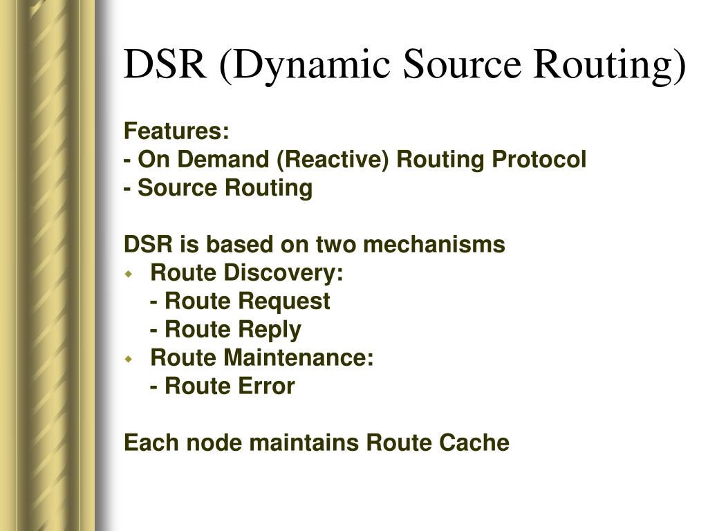 DSR (Dynamic Source Routing) Features: - On Demand (Reactive) Routing Protocol - Source Routing DSR is based on two mechanisms • Route Discovery: - Route Request - Route Reply • Route Maintenance: - Route Error Each node maintains Route Cache