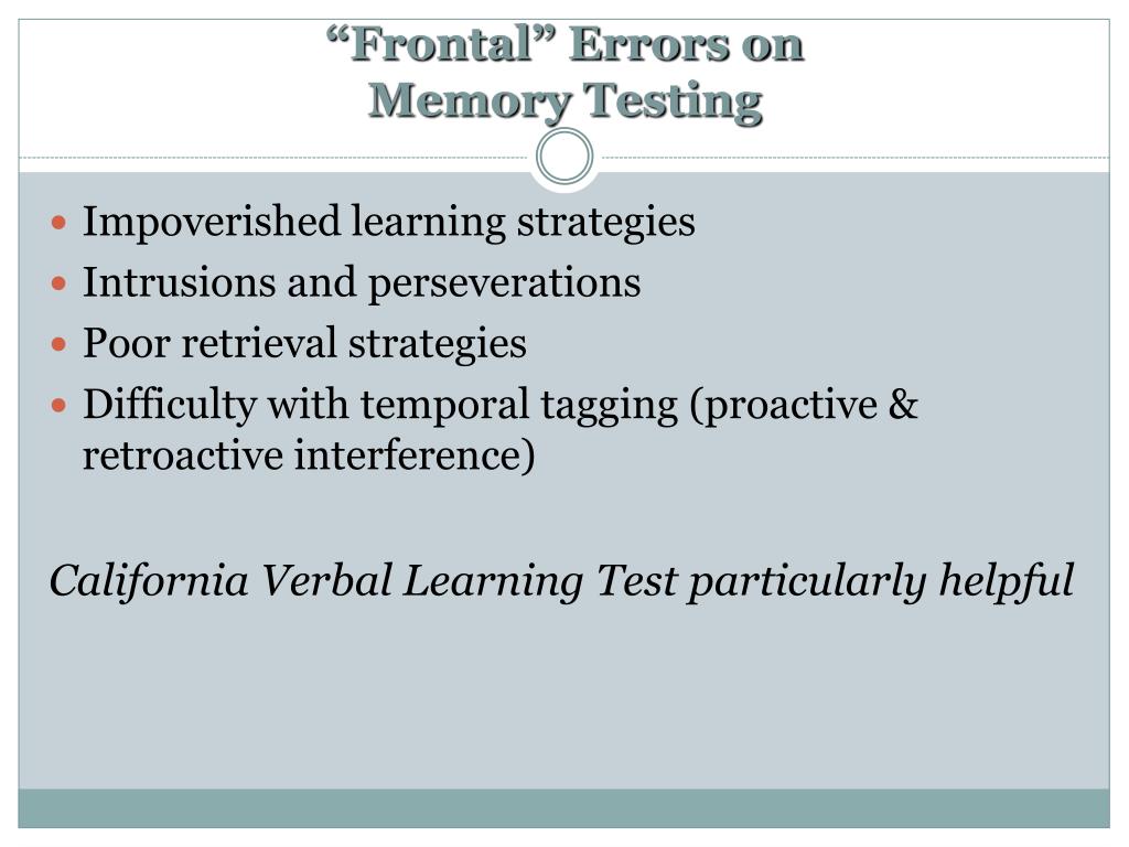 “Frontal” Errors on Memory Testing • Impoverished learning strategies • Intrusions and perseverations • Poor retrieval strategies • Difficulty with temporal tagging (proactive & retroactive interference) California Verbal Learning Test particularly helpful