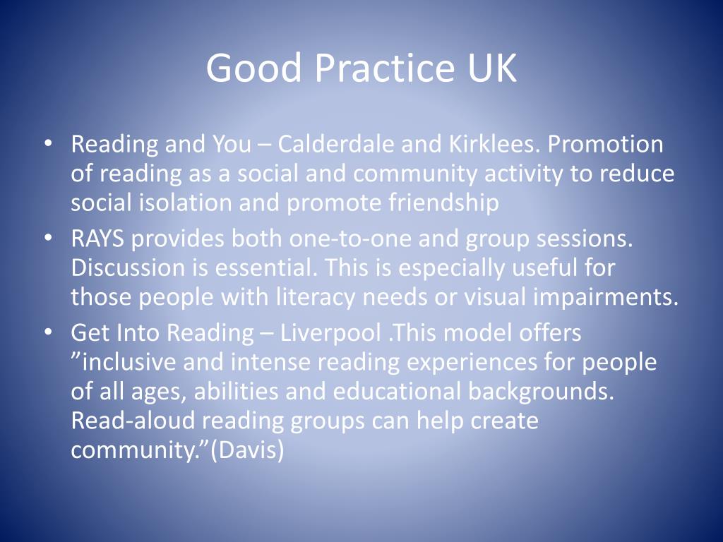 Good Practice UK • Reading and You – Calderdale and Kirklees. Promotion of reading as a social and community activity to reduce social isolation and promote friendship • RAYS provides both one-to-one and group sessions. Discussion is essential. This is especially useful for those people with literacy needs or visual impairments. • Get Into Reading – Liverpool .This model offers ”inclusive and intense reading experiences for people of all ages, abilities and educational backgrounds. Read-aloud reading groups can help create community.”(Davis)