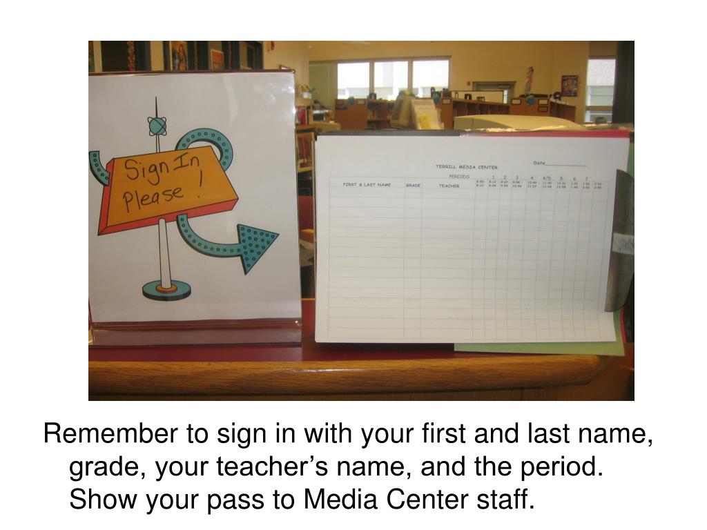 Remember to sign in with your first and last name, grade, your teacher’s name, and the period. Show your pass to Media Center staff.
