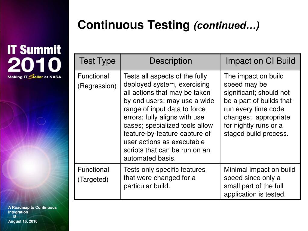 Automated Processes:Continuous Testing Automated testing is an important component of the CI build cycle.