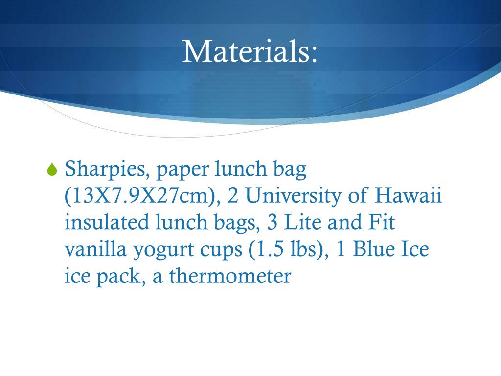 Materials: • Sharpies, paper lunch bag (13X7.9X27cm), 2 University of Hawaii insulated lunch bags, 3 Lite and Fit vanilla yogurt cups (1.5 lbs), 1 Blue Ice ice pack, a thermometer