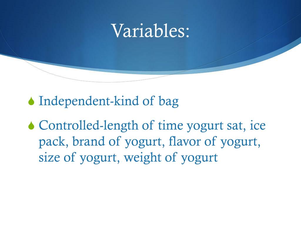 Variables: • Independent-kind of bag • Controlled-length of time yogurt sat, ice pack, brand of yogurt, flavor of yogurt, size of yogurt, weight of yogurt
