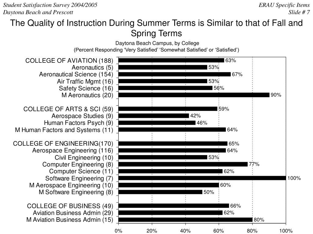 The Quality of Instruction During Summer Terms is Similar to that of Fall and Spring TermsDaytona Beach Campus, by College (Percent Responding ‘Very Satisfied’ ‘Somewhat Satisfied’ or ‘Satisfied’)