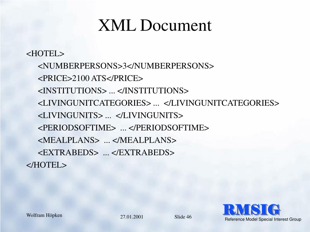 XML Document <HOTEL> <NUMBERPERSONS>3</NUMBERPERSONS> <PRICE>2100 ATS</PRICE> <INSTITUTIONS> ... </INSTITUTIONS> <LIVINGUNITCATEGORIES> ... </LIVINGUNITCATEGORIES> <LIVINGUNITS> ... </LIVINGUNITS> <PERIODSOFTIME> ... </PERIODSOFTIME> <MEALPLANS> ... </MEALPLANS> <EXTRABEDS> ... </EXTRABEDS> </HOTEL>