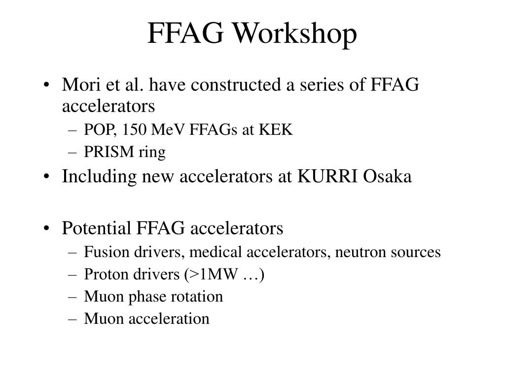 Mori et al. have constructed a series of FFAG accelerators POP, 150 MeV FFAGs at KEK PRISM ring Including new accelerators at KURRI Osaka Potential FFAG accelerators Fusion drivers, medical accelerators, neutron sources Proton drivers (>1MW …) Muon phase rotation Muon acceleration FFAG Workshop