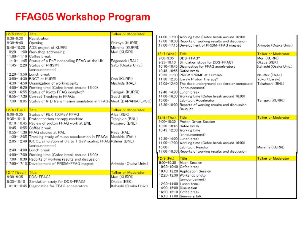 PRISM workshop FFAG workshop Osaka, Japan. David Neuffer. Could be staged at JHF, RAL, Fermilab. Mori et al. have constructed a series of FFAG accelerators POP, 150 MeV FFAGs at KEK PRISM ring Including new accelerators at KURRI Osaka Potential FFAG accelerators