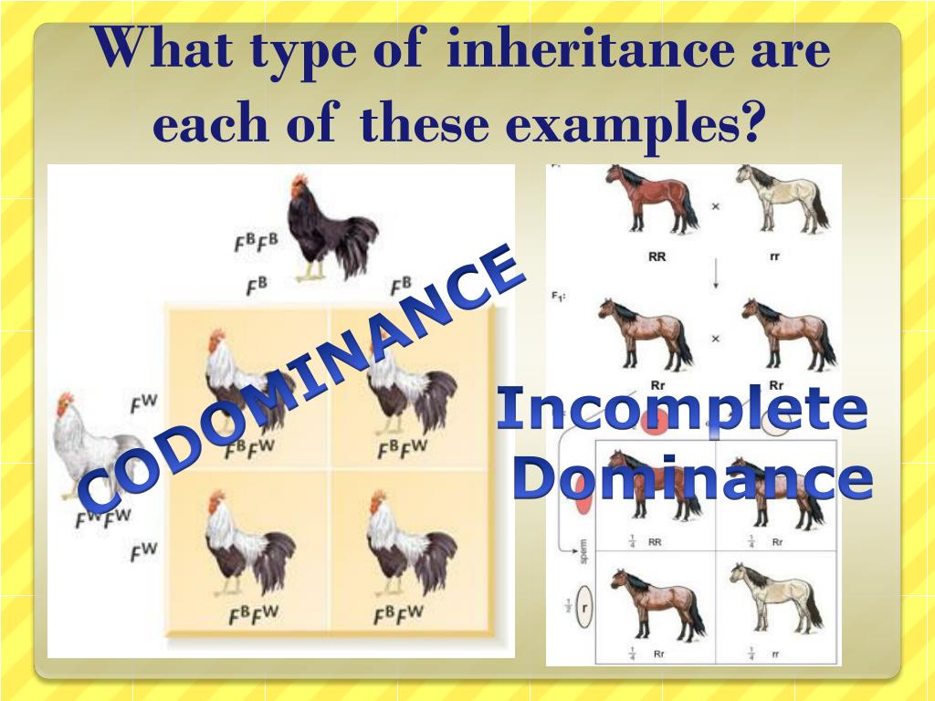 What type of inheritance are each of these examples? CODOMINANCE Incomplete Dominance