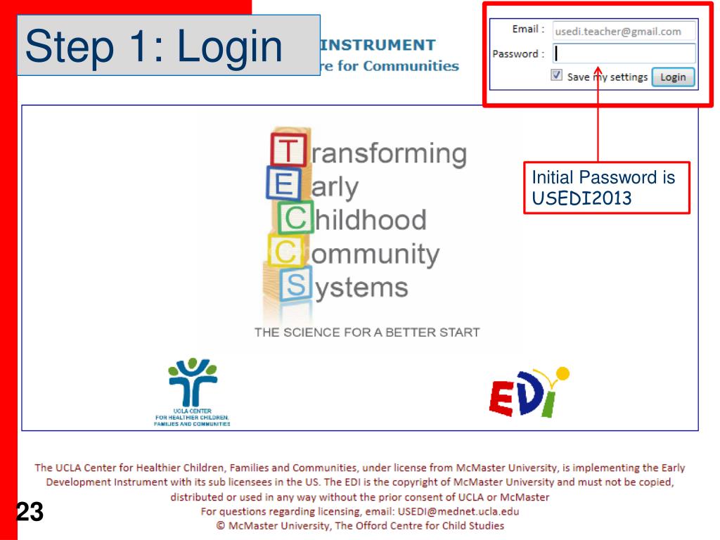 The US-EDI: Simple to Use Step 1: Log in Step 2: Agree to Consent Form Step 3: Create Permanent/Confidential Password Step 4: Check Class Roster Step 5: Complete EDI Questionnaires Step 6: Fill Out Teacher Feedback Forms