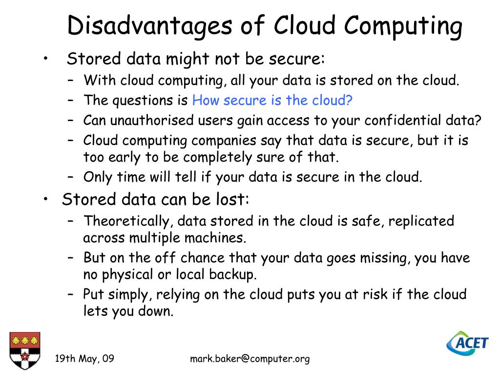 Disadvantages of Cloud Computing • Features might be limited: • This situation is bound to change, but today many web-based applications simply are not as full-featured as their desktop-based applications. • For example, you can do a lot more with Microsoft PowerPoint than with Google Presentation's web-based offering. • The basics are similar, but the cloud application lacks many of PowerPoint's advanced features. • If you are a power user, you might not want to leap into cloud computing just yet. mark.baker@computer.org