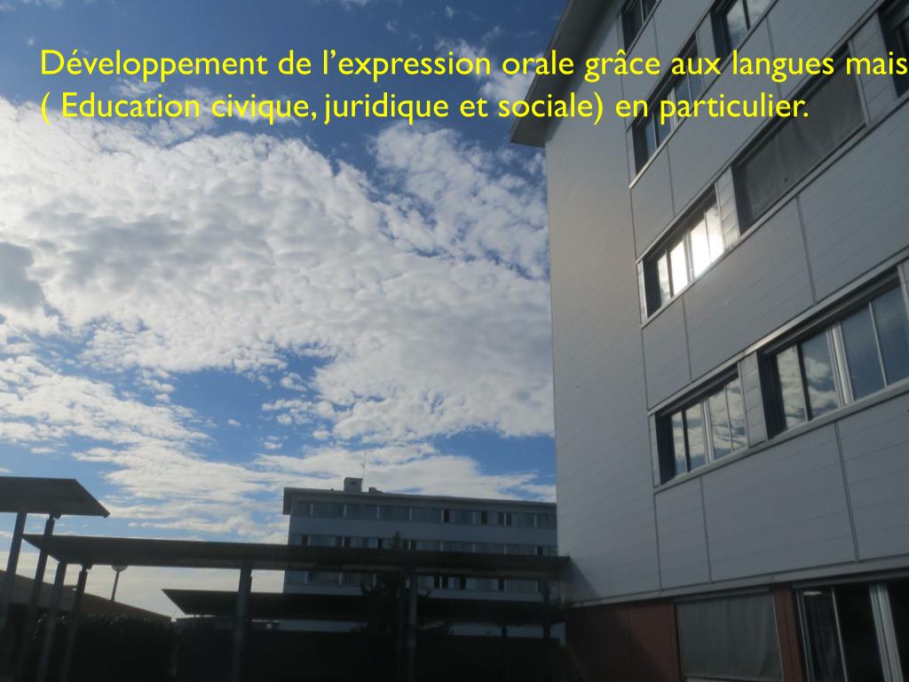 Développement de l’expression orale grâce aux langues mais également grâce à la présentation d’exposés en ECJS ( Education civique, juridique et sociale) en particulier.