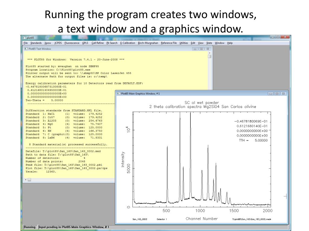 Basic Operating Parameters • Written in Fortran, compiled to run under Windows (any recent version including Vista) • Reads ASCII files in several formats: • Native MED format from NSLS or APS sources • MCA format defined at NSLS • X-Y data • Scintag text file • GSAS format • Spring8 format • Each of these formats has one channel of data per line, with (optional) headers • The MED (multi-element detector) format has as many data points per line as there are detector elements.