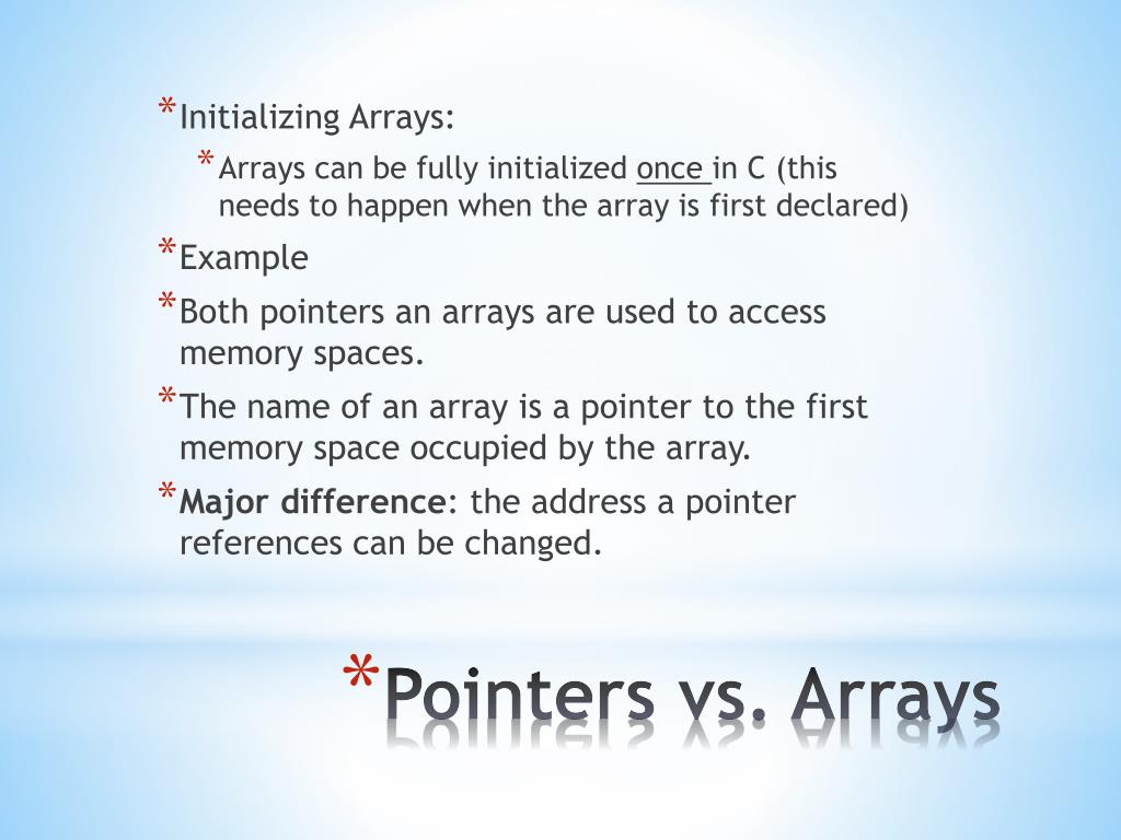 Initializing Arrays: • Arrays can be fully initialized once in C (this needs to happen when the array is first declared) • Example • Both pointers an arrays are used to access memory spaces. • The name of an array is a pointer to the first memory space occupied by the array. • Major difference: the address a pointer references can be changed. Pointers vs. Arrays