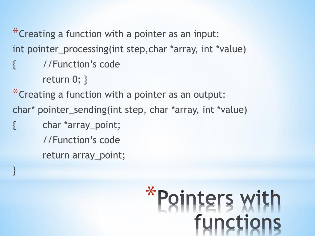 Creating a function with a pointer as an input: intpointer_processing(intstep,char *array, int *value) { //Function’s code return 0;} • Creating a function with a pointer as an output: char* pointer_sending(int step, char *array, int *value) { char *array_point; //Function’s code return array_point; } Pointers with functions