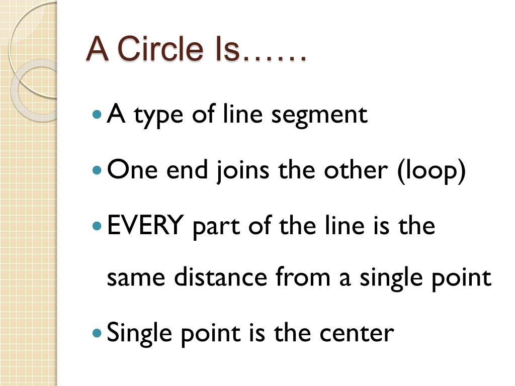 A Circle Is…… • A type of line segment • One end joins the other (loop) • EVERY part of the line is the same distance from a single point • Single point is the center