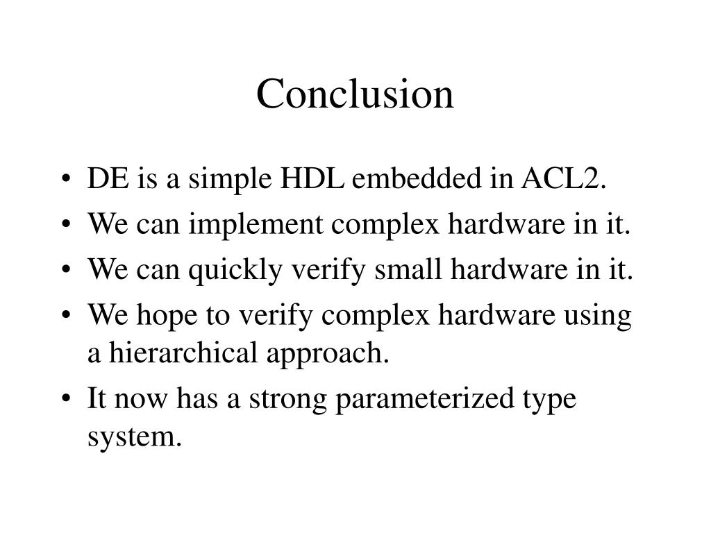 Conclusion • DE is a simple HDL embedded in ACL2. • We can implement complex hardware in it. • We can quickly verify small hardware in it. • We hope to verify complex hardware using a hierarchical approach. • It now has a strong parameterized type system.