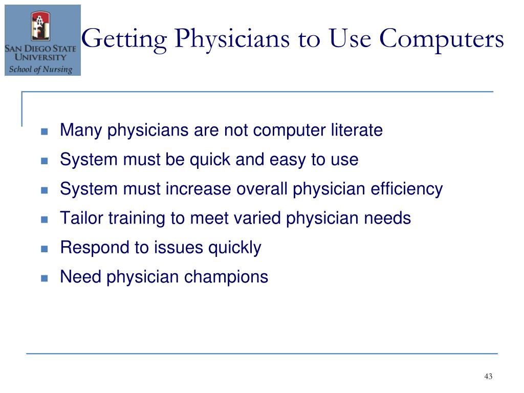 Getting Physicians to Use Computers • Many physicians are not computer literate • System must be quick and easy to use • System must increase overall physician efficiency • Tailor training to meet varied physician needs • Respond to issues quickly • Need physician champions