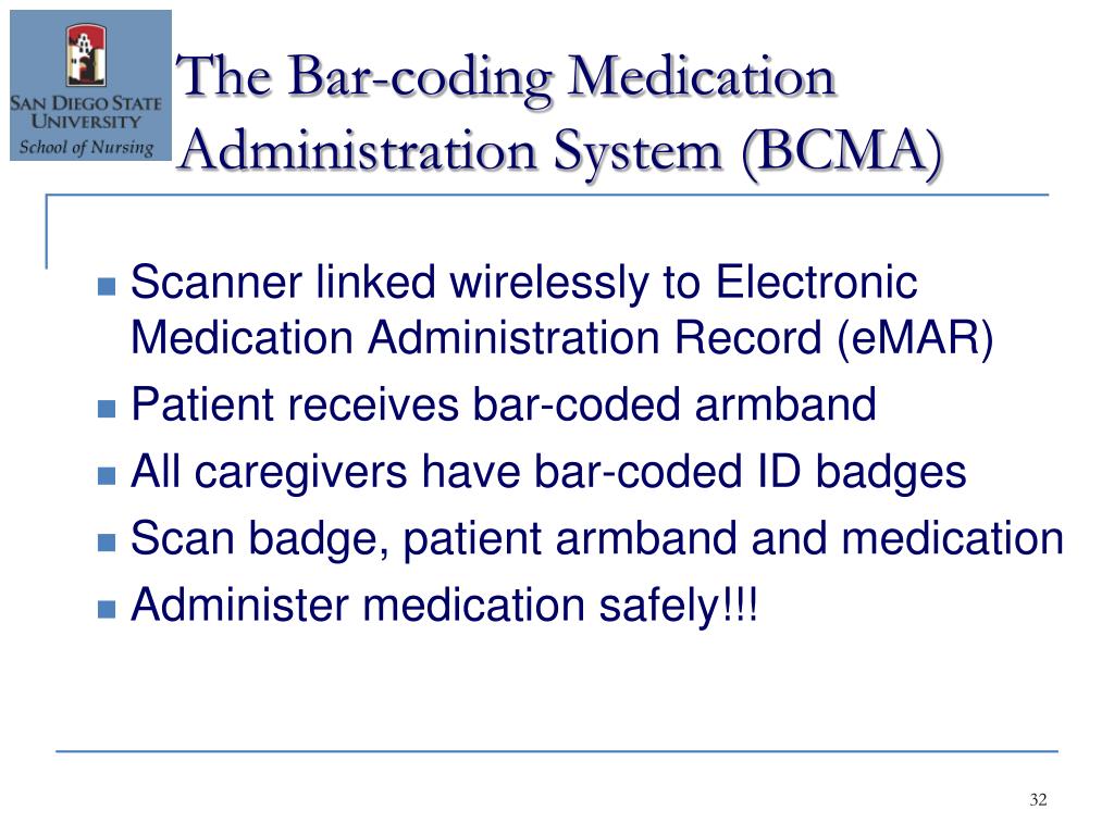 The Bar-coding Medication Administration System (BCMA) Scanner linked wirelessly to Electronic Medication Administration Record (eMAR) Patient receives bar-coded armband All caregivers have bar-coded ID badges Scan badge, patient armband and medication Administer medication safely!!!