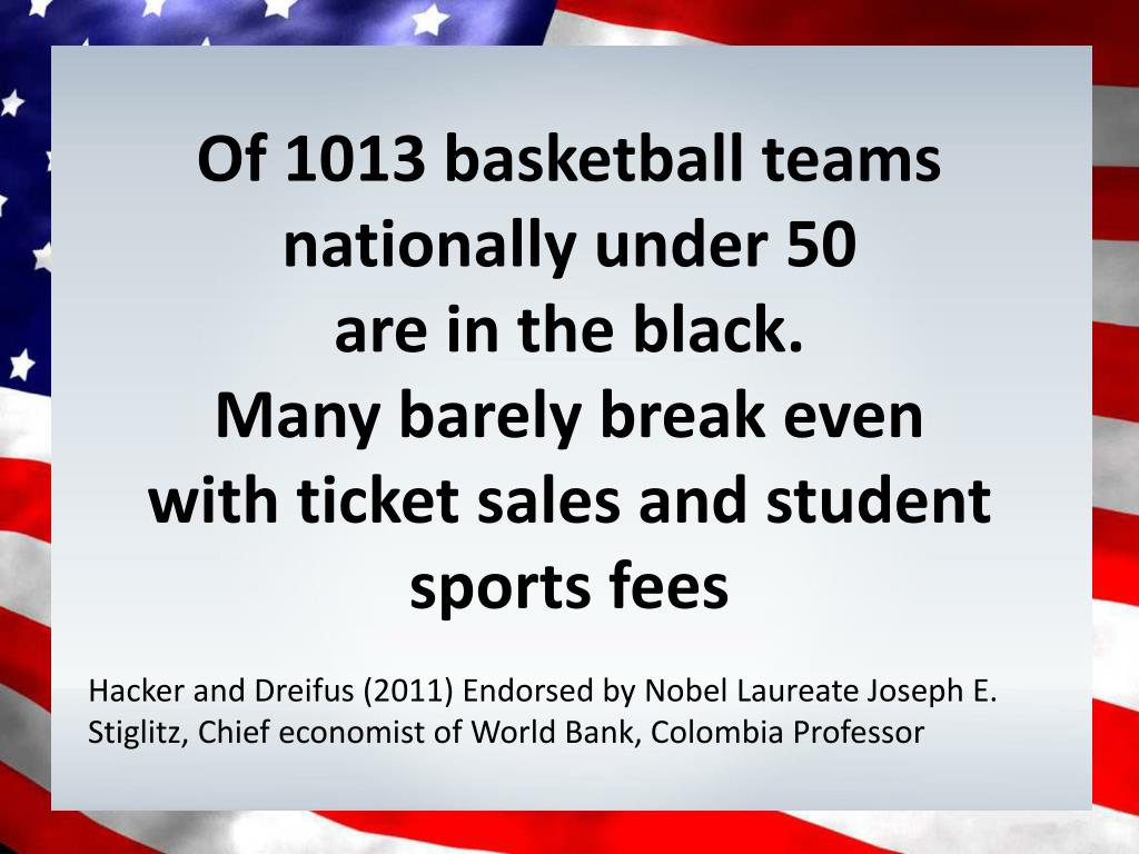 Of 1013 basketball teams nationally under 50 • are in the black. • Many barely break even • with ticket sales and student sports fees • Hacker and Dreifus (2011) Endorsed by Nobel Laureate Joseph E. Stiglitz, Chief economist of World Bank, Colombia Professor