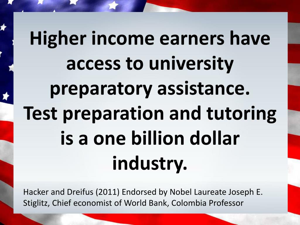 Higher income earners have access to university preparatory assistance. • Test preparation and tutoring is a one billion dollar industry. • Hacker and Dreifus (2011) Endorsed by Nobel Laureate Joseph E. Stiglitz, Chief economist of World Bank, Colombia Professor