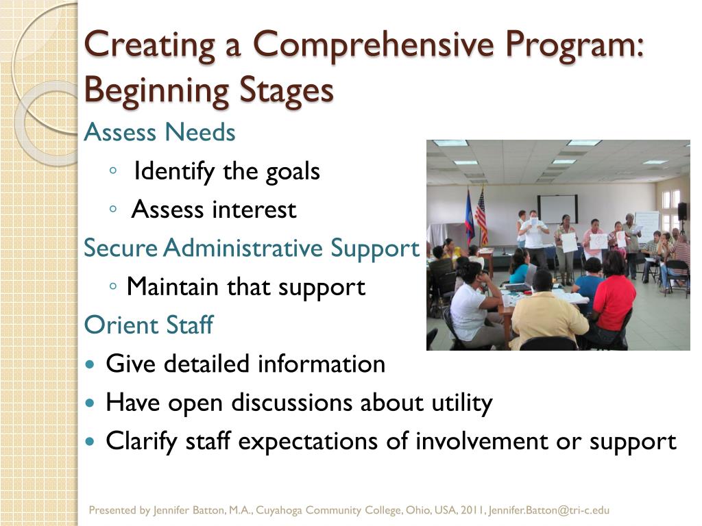 Creating a Comprehensive Program: Beginning Stages Assess Needs • Identify the goals • Assess interest Secure Administrative Support • Maintain that support Orient Staff • Give detailed information • Have open discussions about utility • Clarify staff expectations of involvement or support Presented by Jennifer Batton, M.A., Cuyahoga Community College, Ohio, USA, 2011, Jennifer.Batton@tri-c.edu