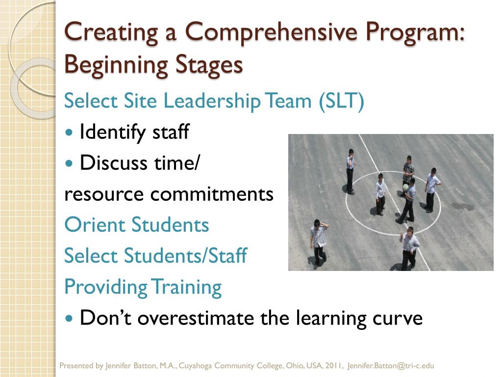 Creating a Comprehensive Program:Beginning Stages Select Site Leadership Team (SLT) • Identify staff • Discuss time/ resource commitments Orient Students Select Students/Staff Providing Training • Don’t overestimate the learning curve Presented by Jennifer Batton, M.A., Cuyahoga Community College, Ohio, USA, 2011, Jennifer.Batton@tri-c.edu